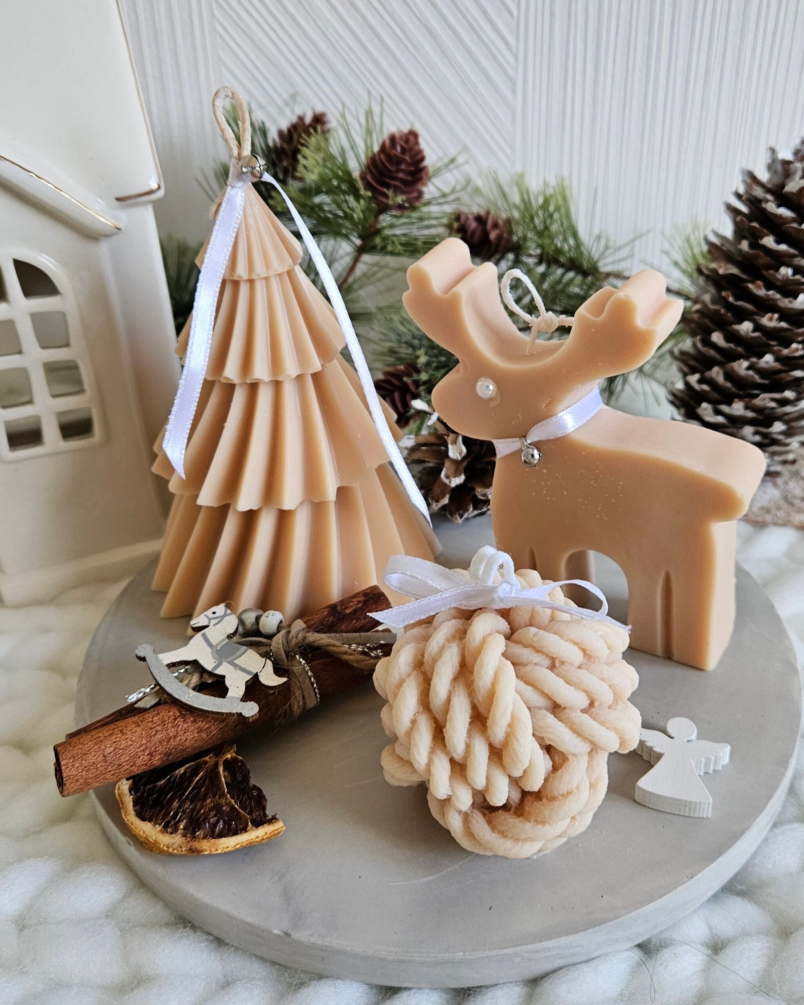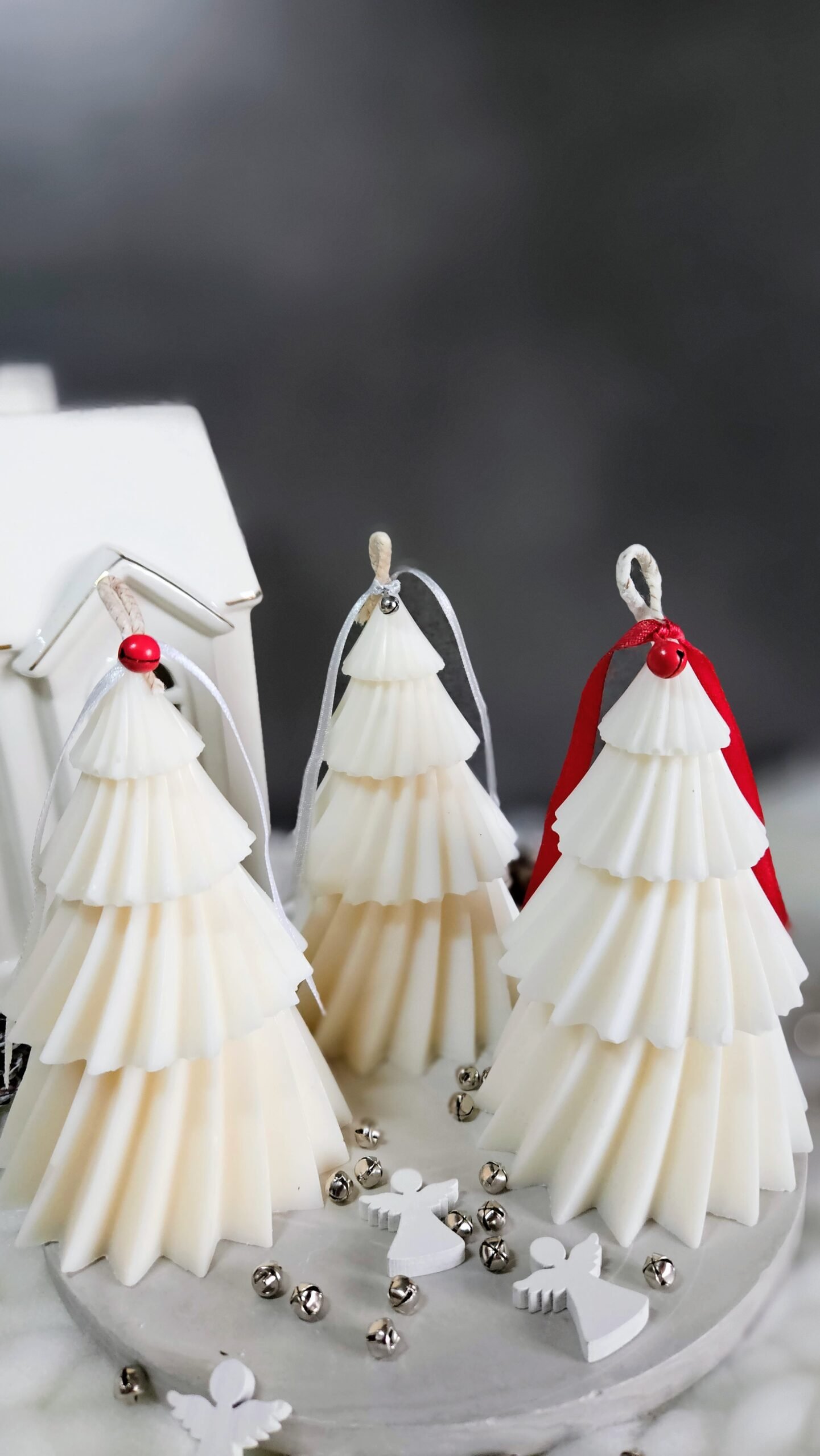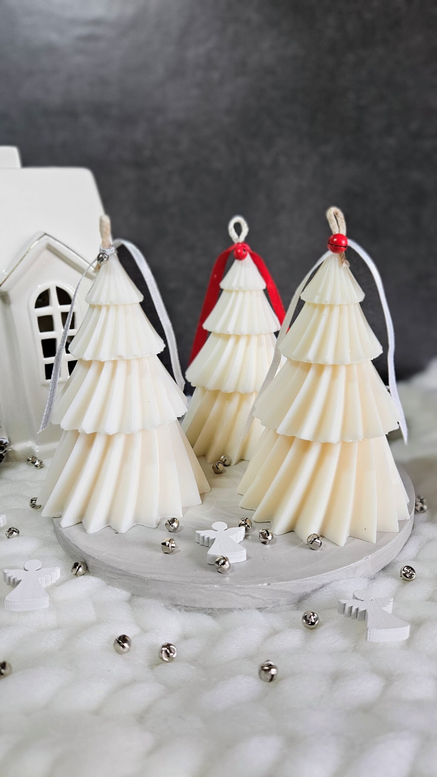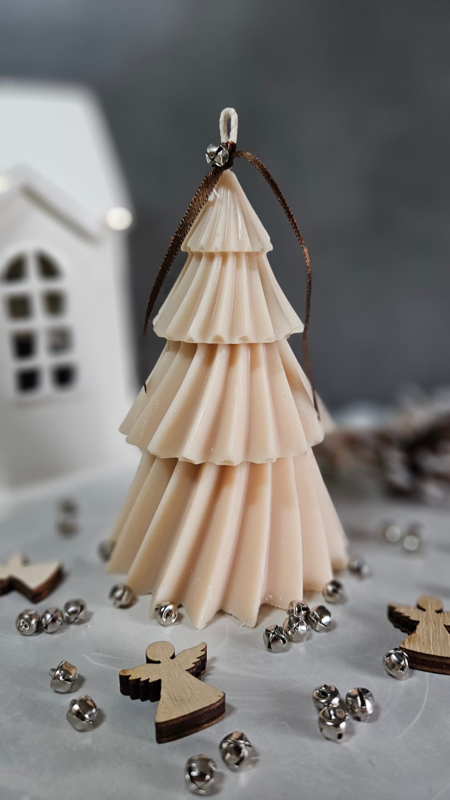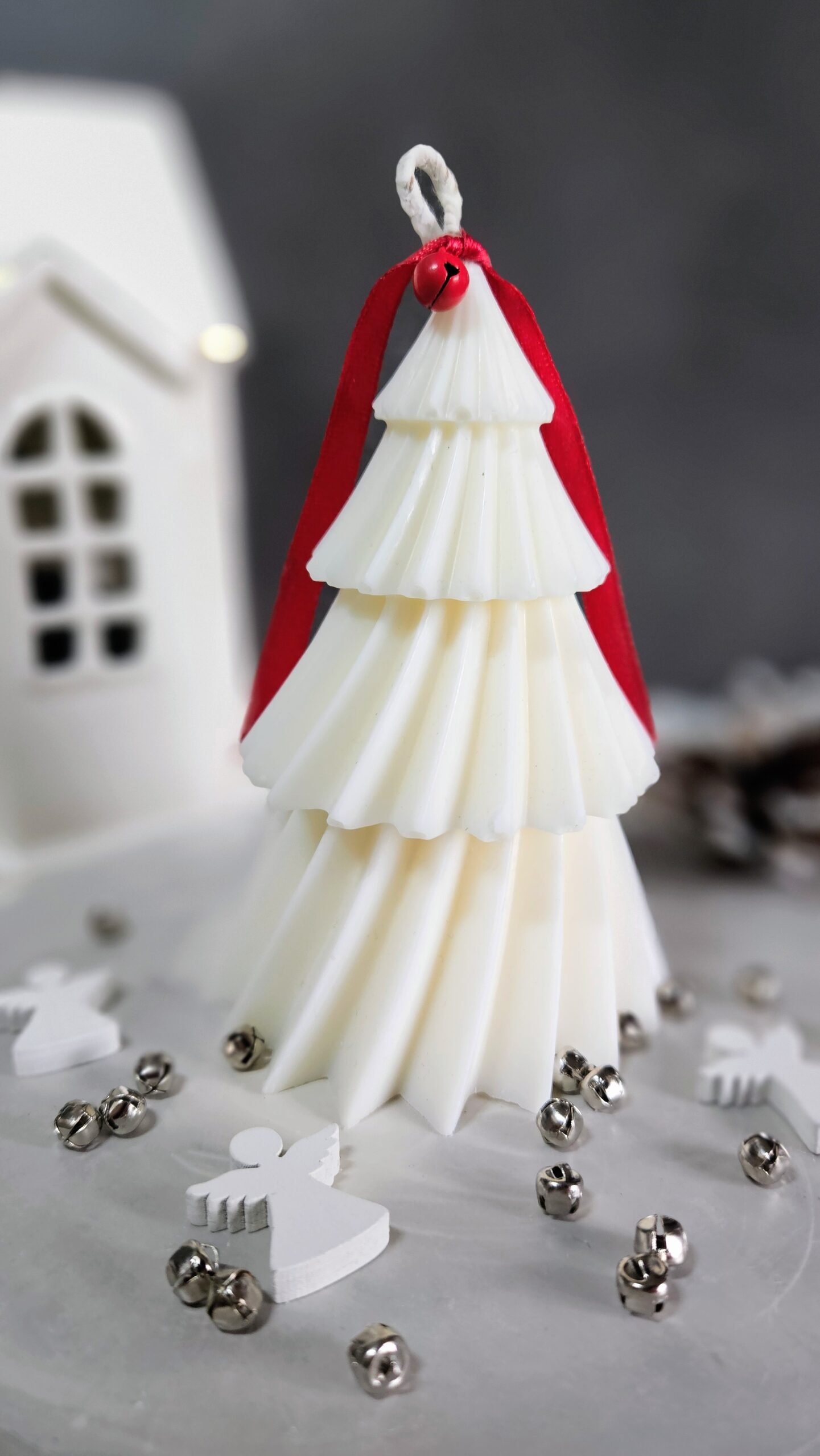 Ett handgjutet sojaljus i form av en klassisk julgran – symbolen för ljus, tradition och samhörighet. Ljuset är tillverkat av 100 % naturligt sojavax och dekorerat med ett rött sammetsband och liten bjällra som ger en extra touch av julmagi.