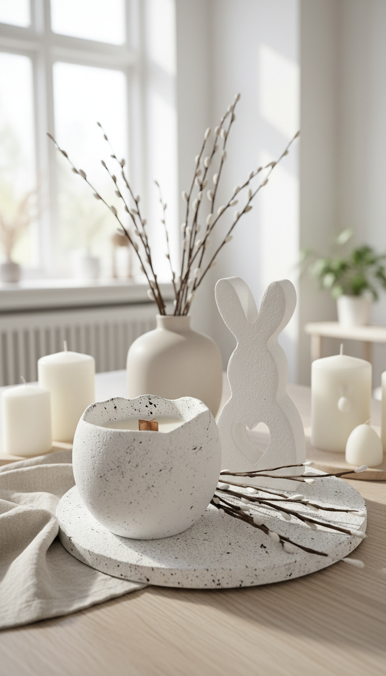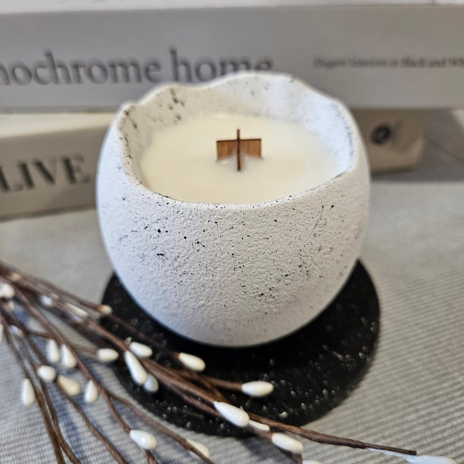 Detta exklusiva ljus är handgjort av naturligt sojavax och hällt i en stilren keramikskål med en vacker, rustik struktur. Den minimalistiska designen i mjuka, neutrala toner gör ljuset till en perfekt inredningsdetalj för alla rum.